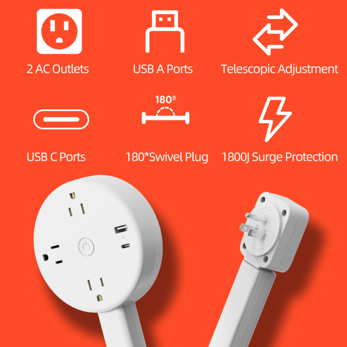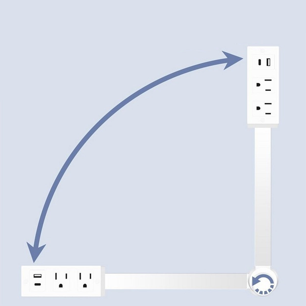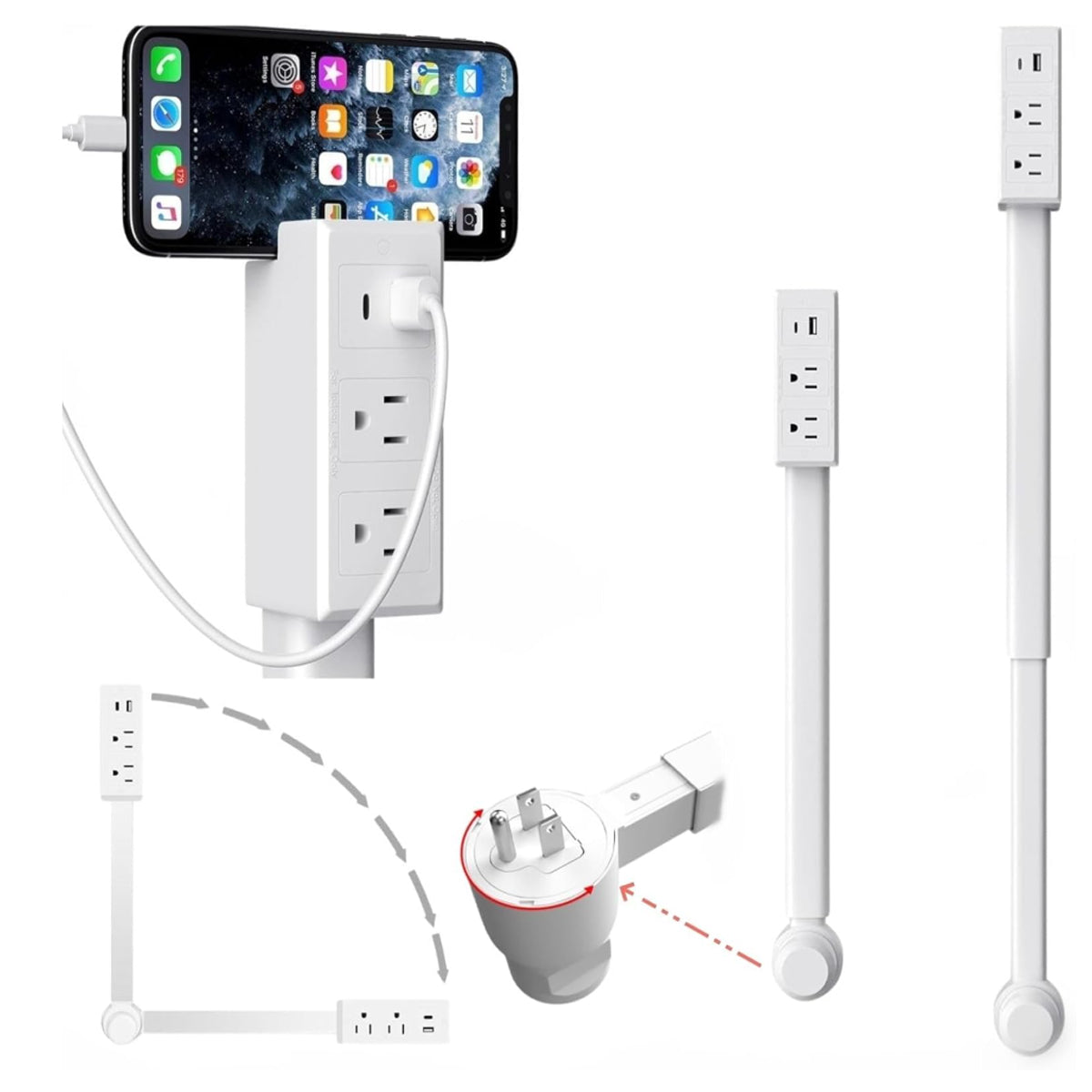 Extends from 16" to 28" and rotates up to 180°, allowing you to reach hidden or hard-to-access outlets behind sofas, beds, and desks. -